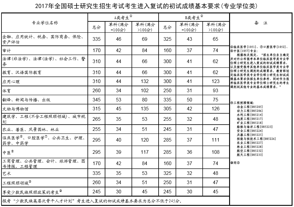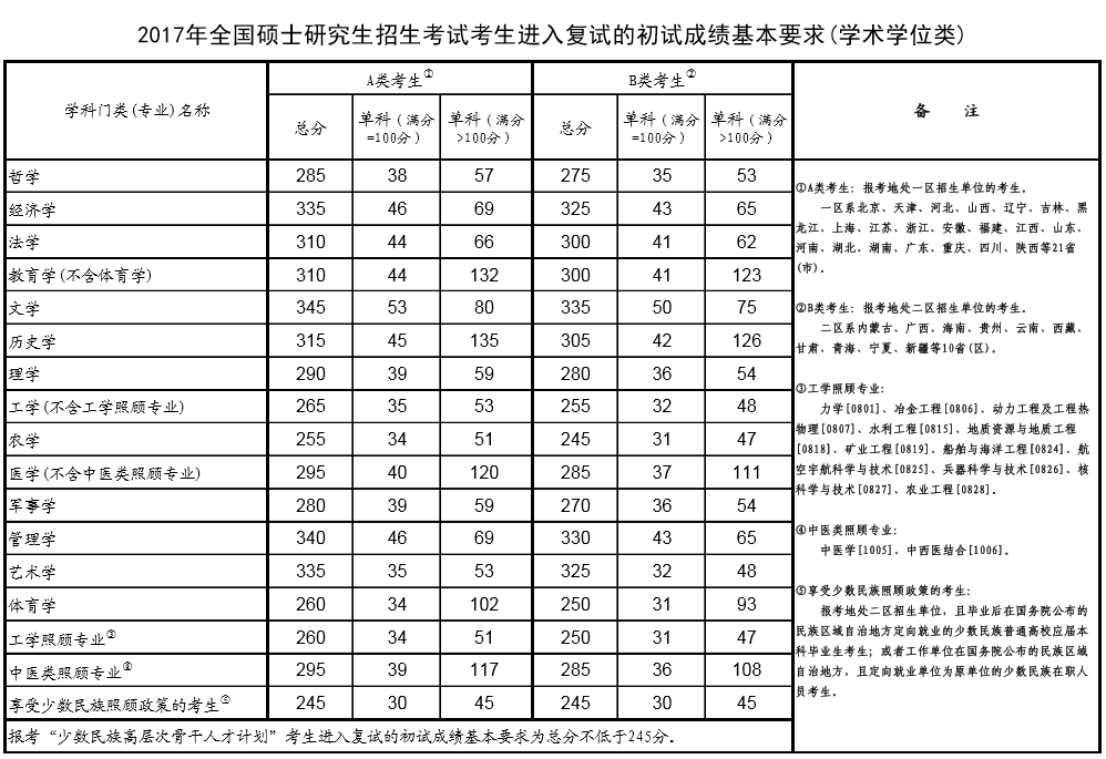 2017年全国硕士研究生统一入学考试考生进入复试的初试成绩基本要求